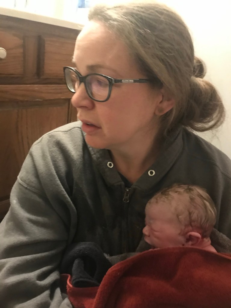 My doula, Tina, finally arrives with a skip in her step. She looks at me, “you’ve got to be shittin’ me! She couldn’t wait until I got here?!” My hands go up in a posture of ‘I don’t know.’
