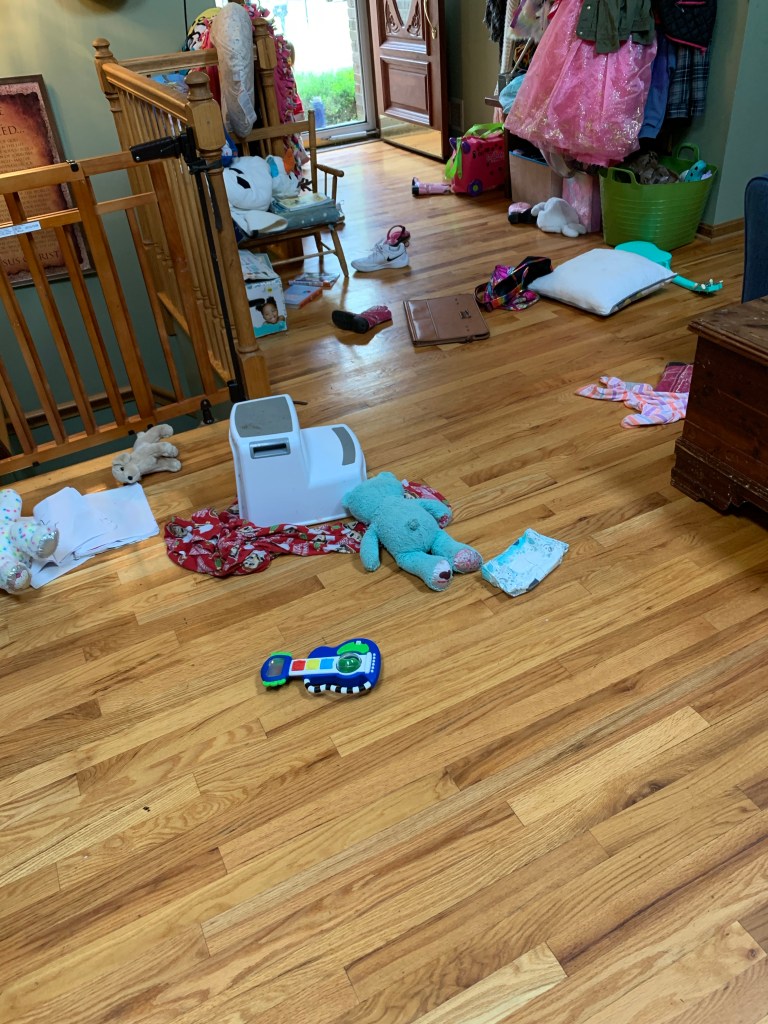 When I’m just a few feet away from the living room, sitting at the kitchen table working on some things and the baby, Torpedo, decides decorating my floor with any and everything is a great idea.
