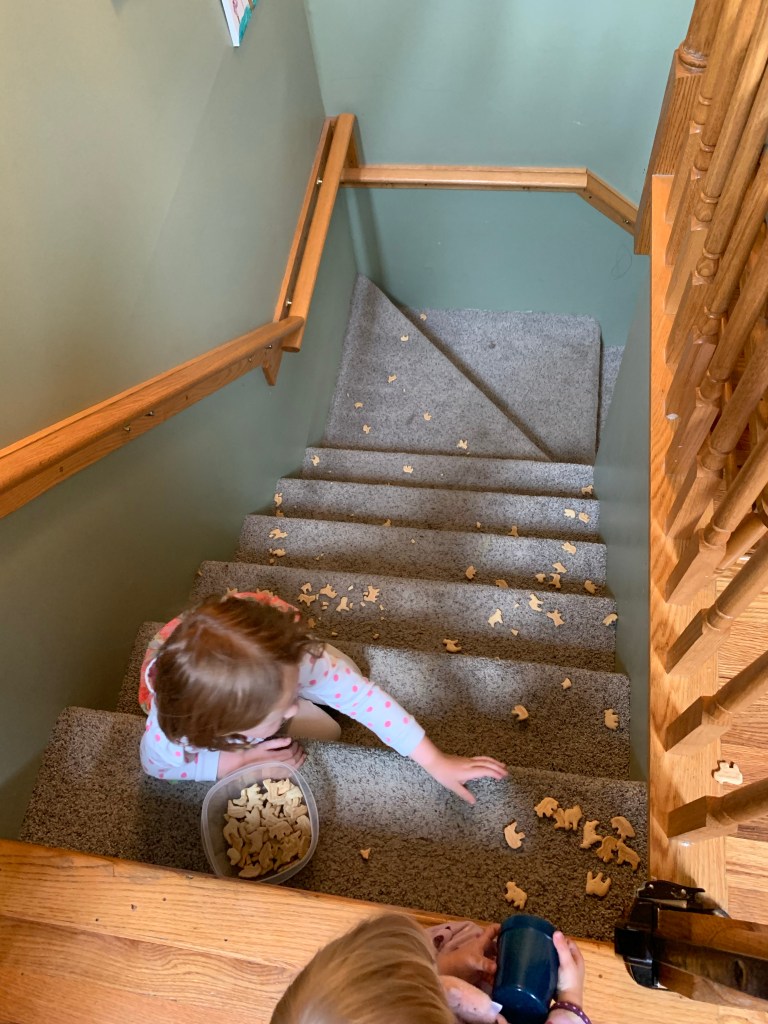 I was finally able to prep and throw dinner into the oven, and these two thought throwing animal crackers down my stairs was a rockstar idea.